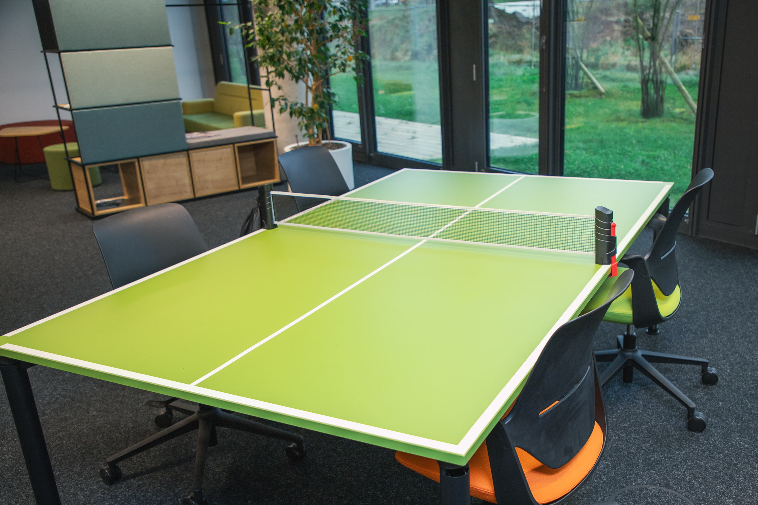 Hier entstehen Ideen: Arbeiten, Chillen, Brainstormen – alles in einem Raum. Ob große Media-Wall oder kleiner Medientisch, du hast immer die passende Bühne. Und wenn du eine Pause brauchst: Tischtennis und Games gehen immer.